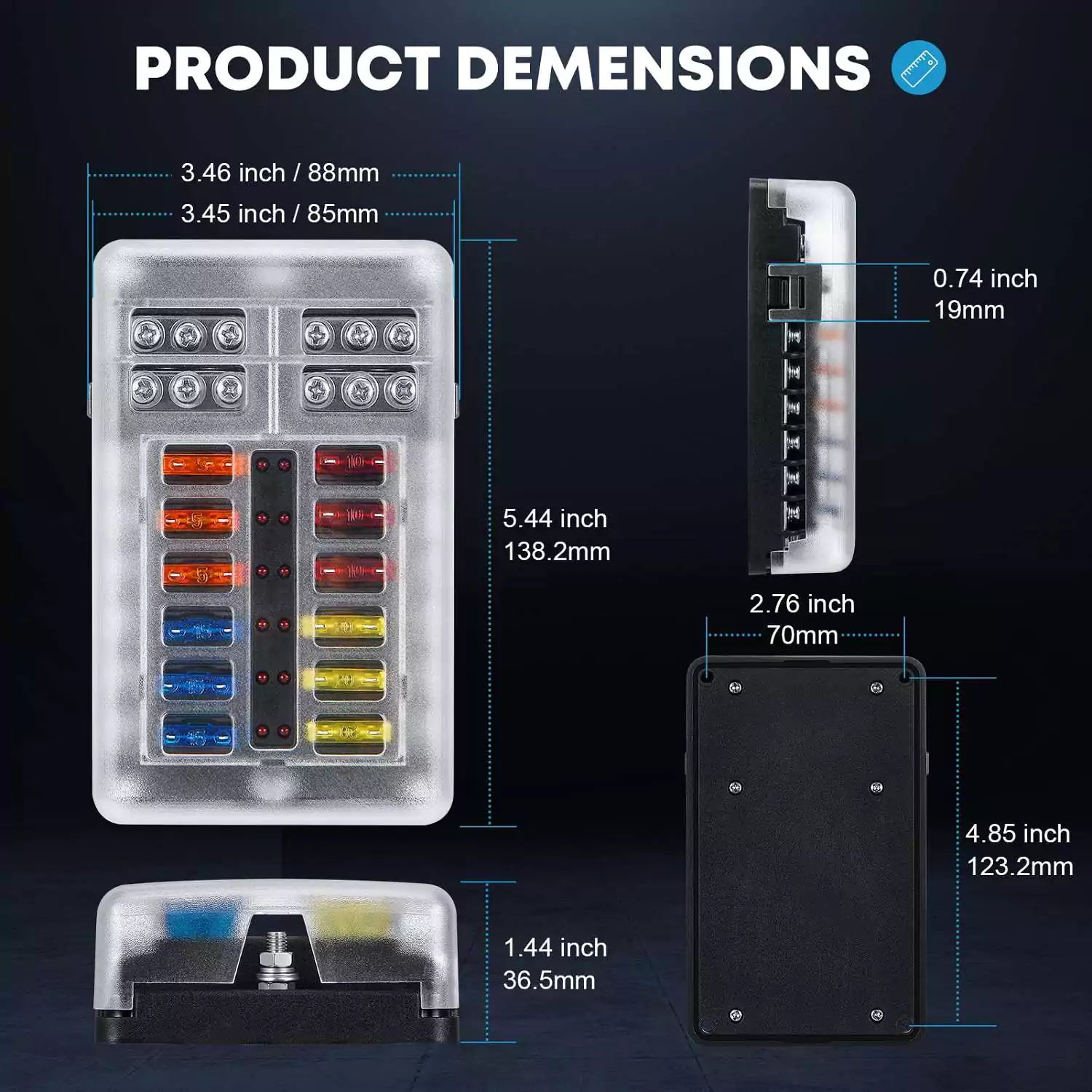 • Waterproof Neat Panel Mount: This 12V waterproof fuse block features a clear PC cover and is designed to be splash and dust-resistant. This construction adds extra protection, making it easy to operate and maintain in various environments.