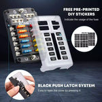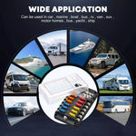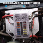 • Safe LED Indicator Design: Our 12V fuse boxes come with 30 fuses (5A, 7.5A, 10A, 15A, 20A, 25A), and each circuit has its own LED indicator light. When a fuse blows, the corresponding indicator lights up instantly, making it easy to identify and fix any short circuits or faults.