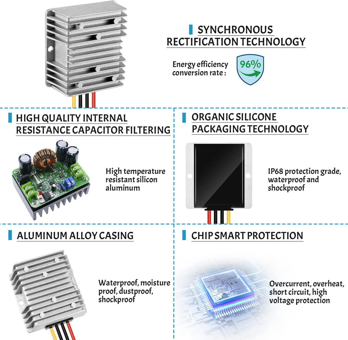 Built with synchronization rectification technology and a smart chip, the Kohree Voltage Converter provides complete protection against over/under voltage input, overload, overhead, and short circuits. It is also 100% waterproof and comes with anti-shock protection, thanks to its aluminum shell and silicone seal design, making it ideal for use in rainy weather or dusty environments. The converter's compact design and high power of 120w make it widely applicable to various applications, including motors, dashcams, vehicles, led strip lights, electric fans, cameras, screens, monitoring systems, solar pads, and DIY projects.