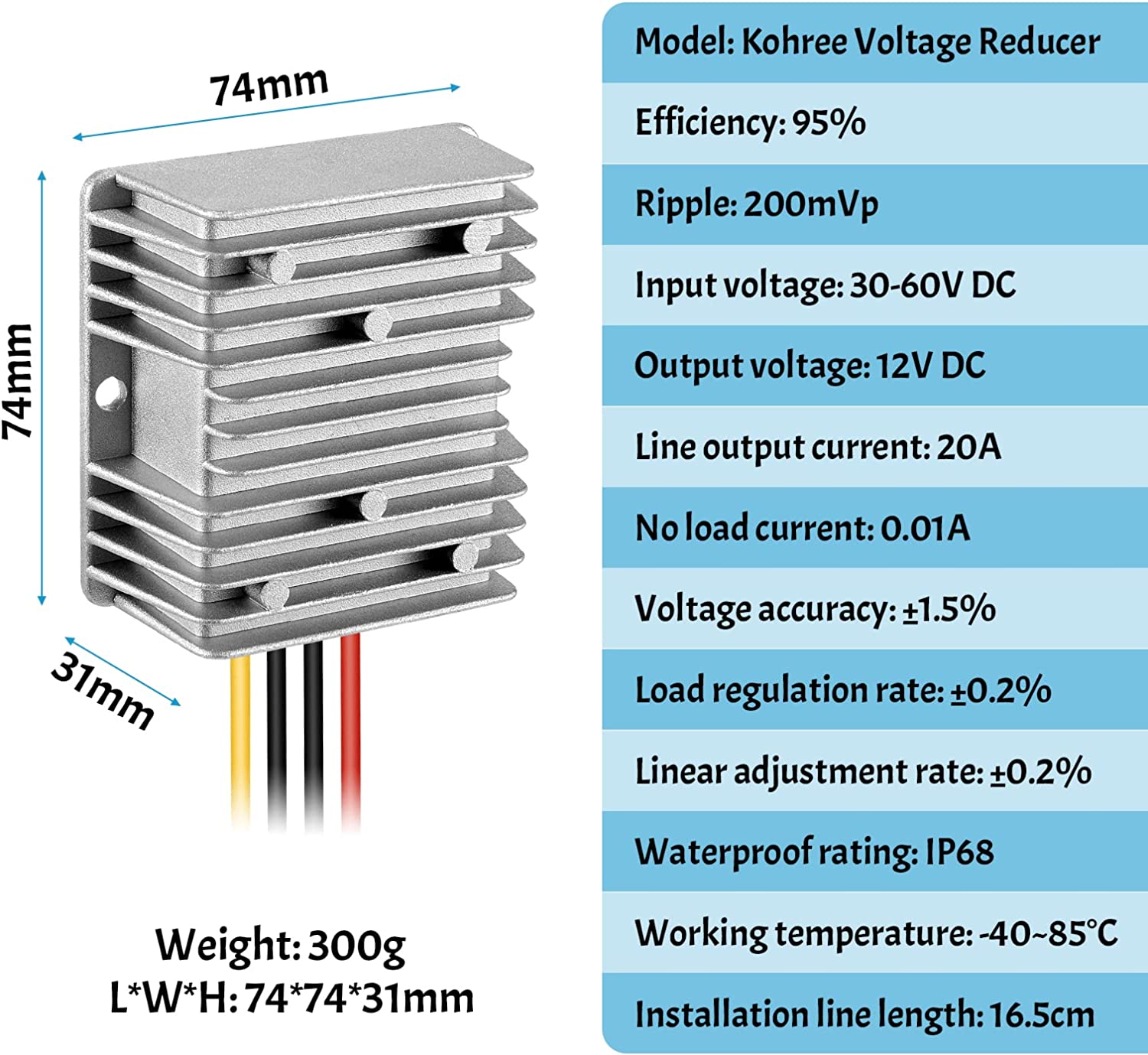 Kohree brings you an upgraded industry-grade DC 36V to 12V step-down converter that is CE listed and offers auto-recovery when devices are back to normal operating. With an outstanding power conversion efficiency of up to 96%, this converter is the perfect choice for those looking for an efficient and reliable voltage converter.