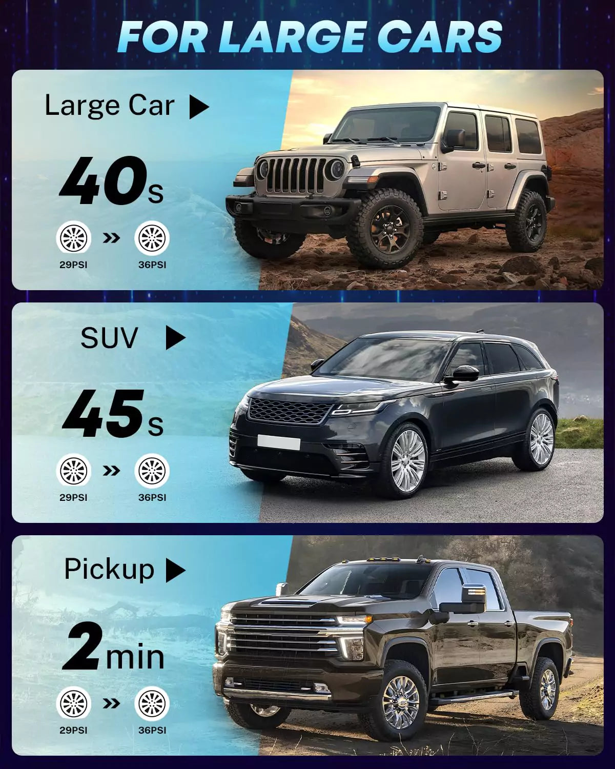 • Inflation time (approx.): About 3 mins (from 0-36 PSI), 40s (Car 29-36 PSI), 55s (SUV 29-36 PSI), 240s (Pickup 29-36 PSI)