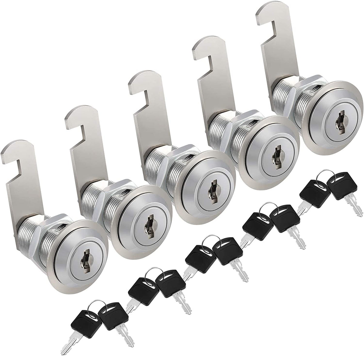 This cam lock set is convenient and practical, featuring a keyed alike lock set with 5 locks and 10 keys (including 5 backup keys) that can be operated with one key. It also has a non-key retaining design that allows for easy removal of the key from the locked and unlocked position.