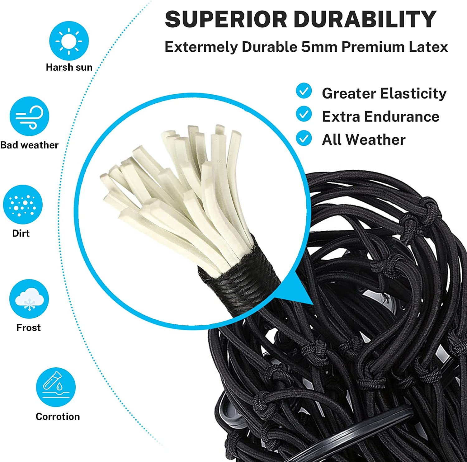 Crafted from thick 5mm latex core bungee webbing and a durable polypropylene coating, this cargo net is built to last, even in the toughest weather conditions. And with its stretchable 4'x6' design, this net can easily accommodate loads up to 8'x12', making it perfect for everything from camping gear to construction materials.