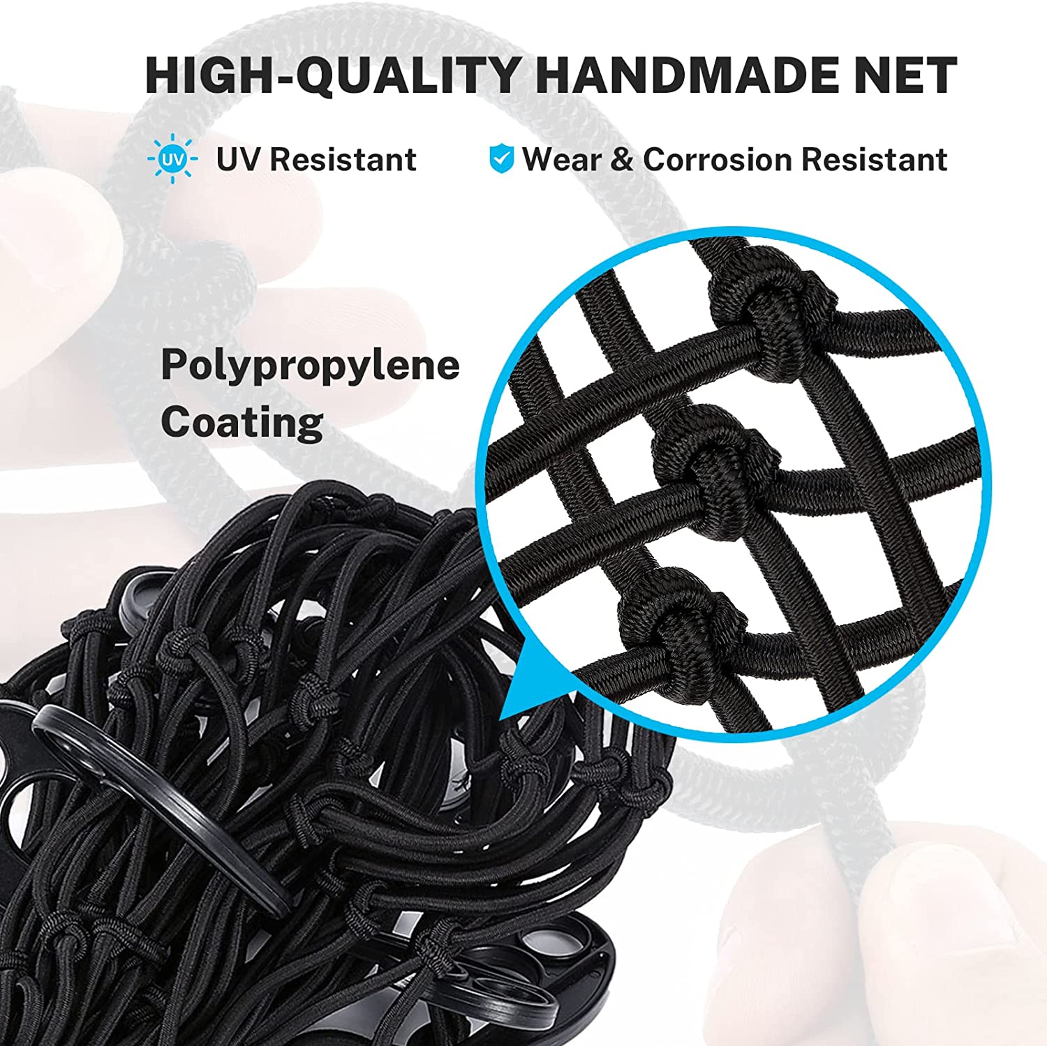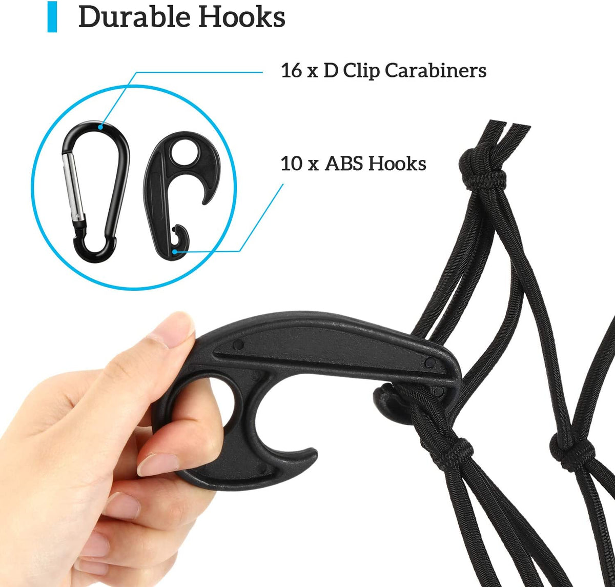 But what really sets this cargo net apart is its versatility. With 16 D shape aluminum clip carabiners and 10 ABS hooks included, you can easily strap down your cargo and ensure a tangle-free experience every time. And when it's time to store the net away, simply pop it into the included drawstring storage bag and keep it under the seat in your truck or in your garage.