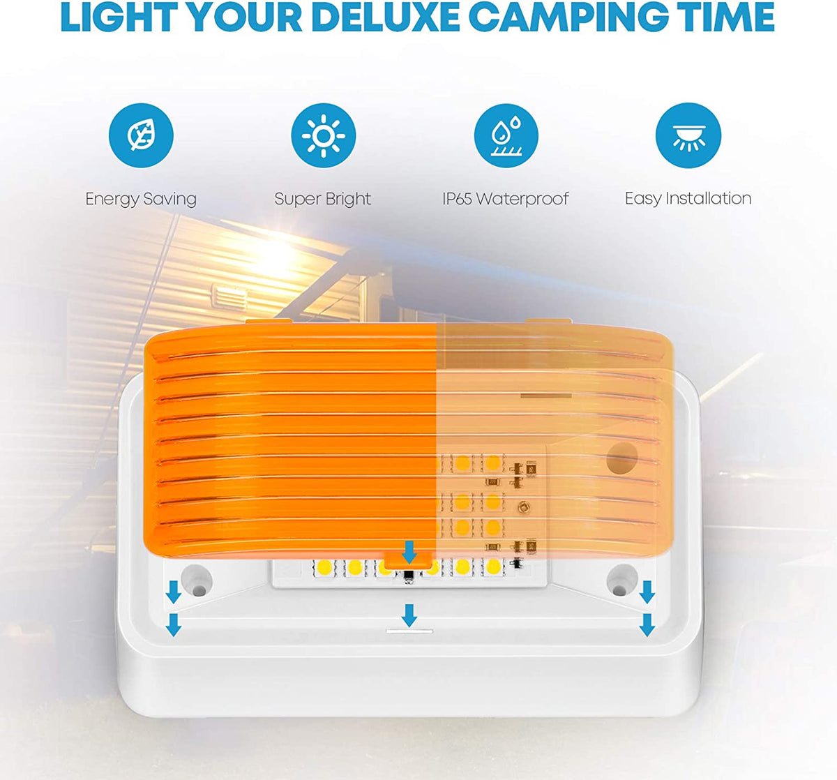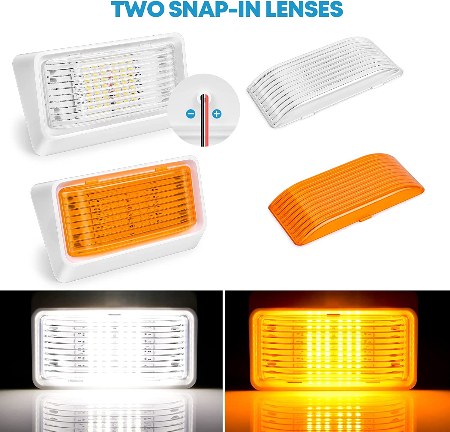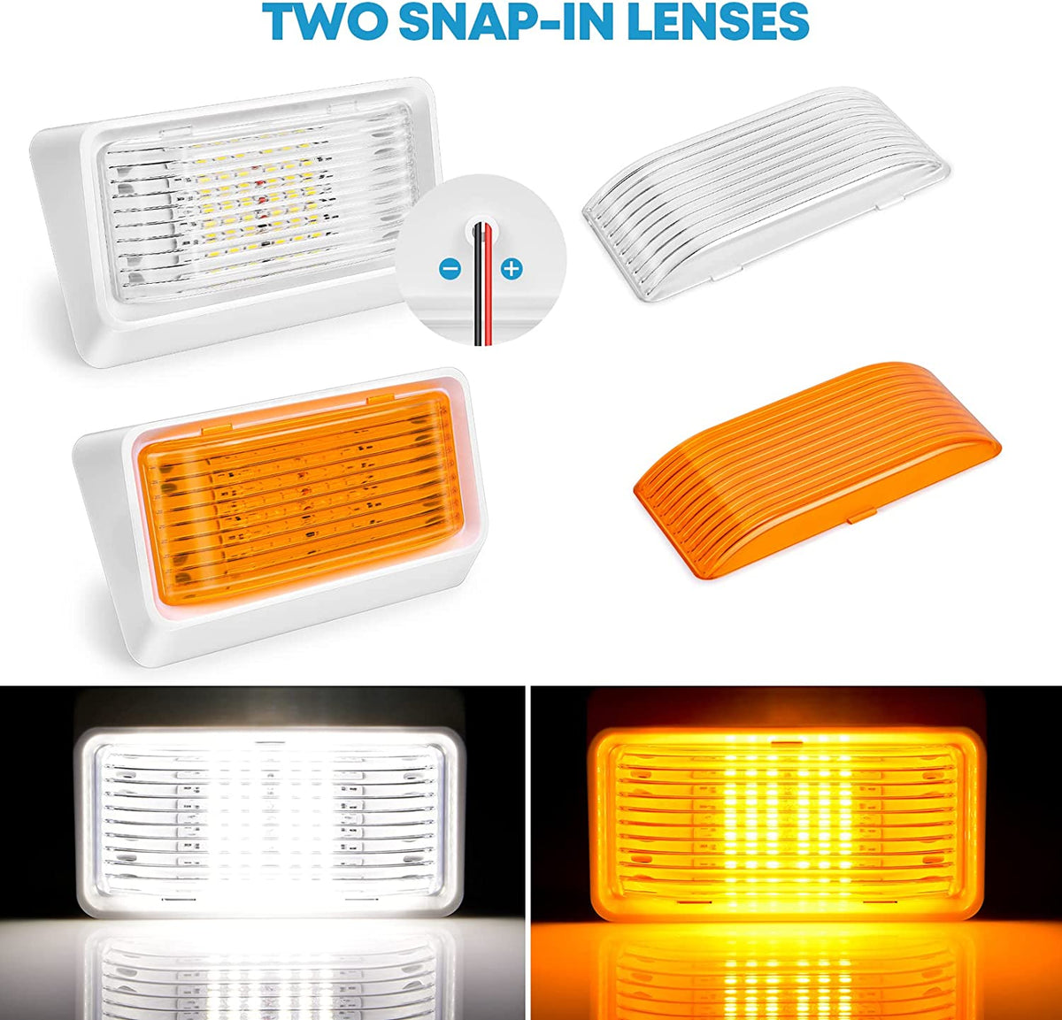 Die Kohree RV-Verandaleuchte wird mit zwei austauschbaren Snap-In-Linsen (klar und bernsteinfarben) geliefert und verfügt über insgesamt 24 leistungsstarke 5050-LEDs mit einer Lichtleistung von 320 Lumen. Mit langlebigen Linsen und einer kompakten Größe von 15,4 cm x 9,2 cm x 4,6 cm (6 x 3,6 x 1,8 Zoll) ist diese RV-Verandaleuchte die perfekte Beleuchtungslösung für jedes Freizeitfahrzeug.