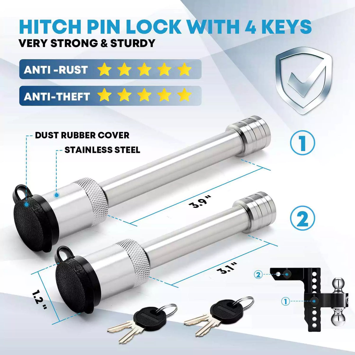 • Sicher und robust : Schützen Sie Ihre Investition mit unseren fortschrittlichen Diebstahlschutzmaßnahmen. Ausgestattet mit zwei Edelstahl-Anhängerkupplungsbolzenschlössern und vier einzigartigen Schlüsseln bietet unsere Bolzenkupplung unübertroffene Sicherheit und schützt Ihre Anhängerkupplung und Ihren Anhänger vor Diebstahl, sodass Sie auf jeder Fahrt absolute Sorgenfreiheit haben.